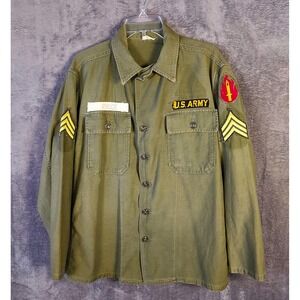 Vintage 60s US Army Trooper Fatigue Vietnam Field Cotton Utility Shirt Size Medium. Shirt is in excellent vintage condition. No holes, blemishes or signs of excessive wear. Measurements are in the photo section. Measurements are also listed here. Shoulder seam to shoulder seam 18" Armpit to armpit 22" Collar to hemline 29" Collar to cuff ending 30" Know your measurements to avoid return.