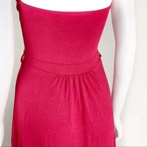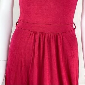 Brand new with tags. Never been worn. Halter dress in beautiful blood red color. Three black button on front bodice. Empire gathered waist. Belt loops but does not come with a belt. NO BELT. Dress it up for the evening or Dress it down with flip flops. Super soft comfortable fabric.