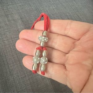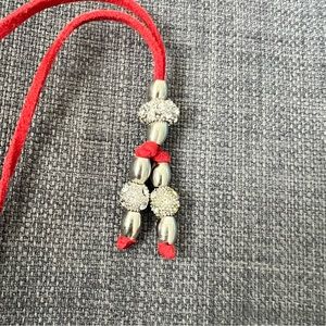 Sparkly necklace with silver and cubic zirconia type stones on red leather cord. Silver bead can be pulled up to make the length adjustable