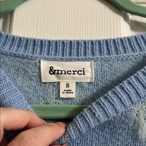 NWT &merci blue and white diamond print sweater never worn. The lines throughout the sweater have a fuzzy look to them. The sweater itself is striped with the diamond pattern throughout. There are also small crystals throughout as shown.