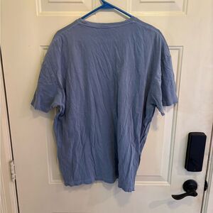 Blue distressed t-shirt featuring a bold skull graphic. Perfect for a casual, edgy look.