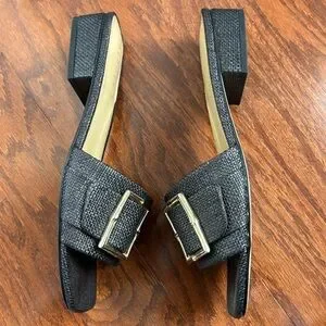 A chic and easy go-to any day of the week. Your new favorite slides with a bold, chunky buckle strap and a sleek square toe. Crafted from raffia with a low block heel for everyday comfort. Memory foam footbed feels great all day. Arch padding for extra comfort and support. Flexible outsole for improved stability.