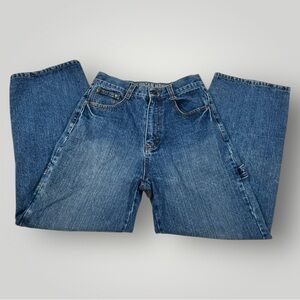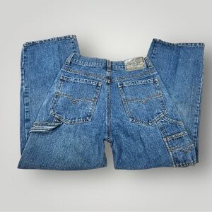 Tony Hawk carpenter blue jeans. Five functional pockets front and back, button and zipper fly. Great preowned condition, note blemish on leg. See details photos!