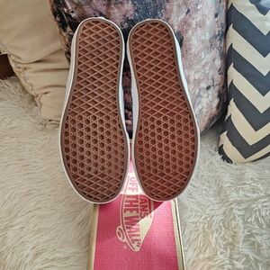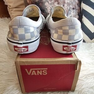Vans classic canvas slip-ons in a light blue & white checkeredboard pattern. Box included.