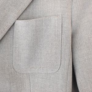 Hidden shoulder pads. Notched lapels. Three button front and slit sleeves. Two front sewn on pockets and a small breast pocket. Pockets have a subtle over stitching that gives this blazer a little Western flare.