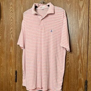 Keywords: Peter Millar, Polo shirt, Mens, Large, Striped, Golf, Athletic, Casual, Short sleeve, Sportswear, Performance polo, Pink striped polo, Gray striped polo
