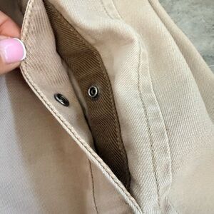 Features: Button front, waist tie belt, side pockets, adjustable sleeve tabs