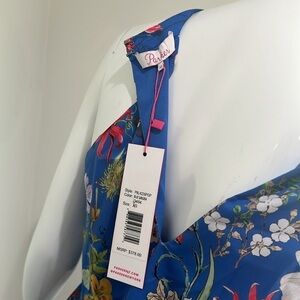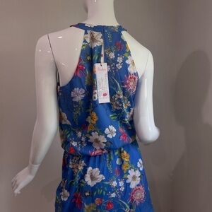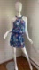 Stock photos are in a darker blue, actual dress is in a vibrant blue with multi color floral print. Halter neckline with wrap bodice with snap closure and keyhole opening. Happy to answer questions