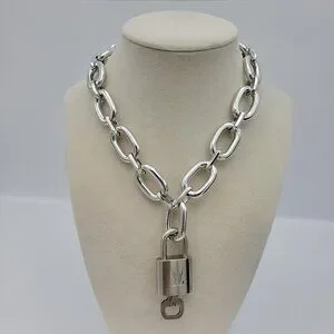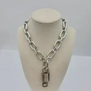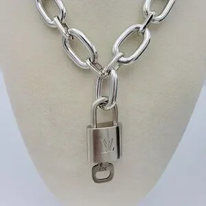 Luxurious and elegant stainless steel silver plated chain necklace featuring a louis vuitton padlock pendant. Perfect for adding a touch of luxury to any outfit daily.