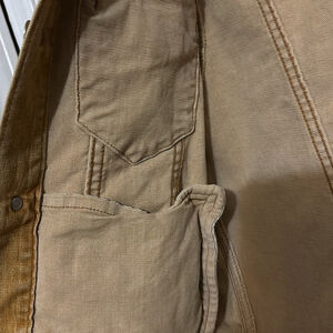 Free People x MF 2 collaboration denim jacket. Excellent preloved condition. Color: Gold ish tan. Material: 98% Cotton, 2% Spandex. Features: Two deep interior pockets, two exterior slit pockets, two button chest pockets. Soft and stretchy denim.