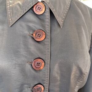 Condition: good vintage condition. Size tag removed. Care tags show wear. A little wear on button on back right. Single-thread pull on right sleeve. Minor wear on collar.