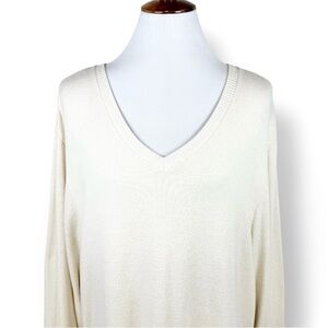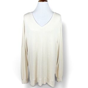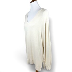 Anthropologie, Saturday Sunday cream long sleeve pullover sweater. Lighter weight soft brushed fleece fabric. V Neck, longer length, slight high low hem, side hip vents, straight silhouette, regular fit.