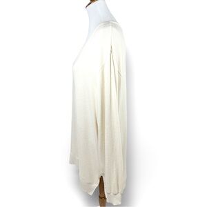 Style tags: Womens sweater, shirt, pullover, pull over, popover, tunic, shirt, knit top, high low, high-low, v neck, scoop neck, long sleeve, lightweight, normcore, minimalist, stretch knit, viscose, slub knit, felt, nubby knit, popcorn, marled, fleece, casual, office, business casual, ivory, off white, cream, ecru, beige, oatmeal, eggshell, anthro, anthropologie, large