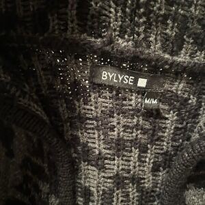 Y2K Open Front Cardigan Black Grey Purple Print Sz M Pockets Ribbed Collar Cozy