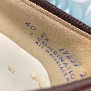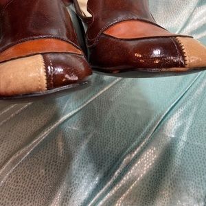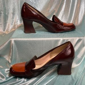 Vintage 70’s brown vinyl with cream and rust block heel pumps. 3. Size 6b