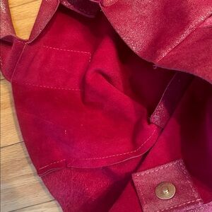 Fuchsia pink and sparkle with cowgirl fringe. Excellent condition. Faux leather, beautiful inside with an attached wallet. Very good quality. This bag gets complements.