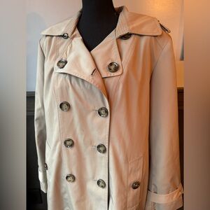 Stylish double-breasted trench coat. Features classic design and button details. Ideal for versatile wear. Does not come with a belt. Euc. Plaid flannel lined