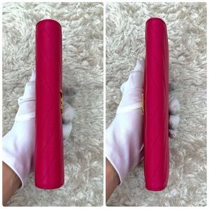 Vibrant fuchsia leather wallet with iconic YSL emblem. Stylish envelope shape.