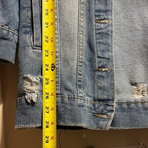 Stylish distressed denim jacket with button closure. The Longer length is perfect for a boho, streetwear, or even grunge look, depending on how you style it!! This casual jean jacket is size Medium and in great condition with no rips, stains, or worn spots. Normal fabric wear from being worn and washed can exist. Sizes also vary depending on brands, so please see all photos for condition and measurements.