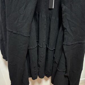 Cozy black knit cardigan-coat with pin. 100% virgin wool. Interesting seam and finished ends like felted wool. Typical Rundholz. Received for Xmas and too oversized for me.