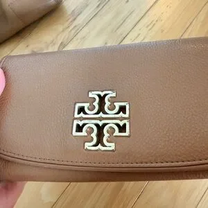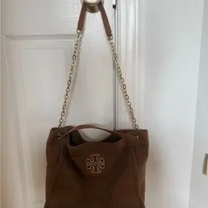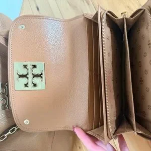 Elevate your style with this Tory Burch brown leather bag set. There is some slight tarnishing where the chain goes through the holes as showed in the pictures, however, other than a few signs of wear and tear the bag and wallet are in great condition.