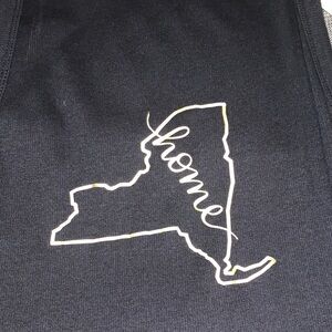 Stylish black tank top featuring a gold outline of New York with 'home' text.