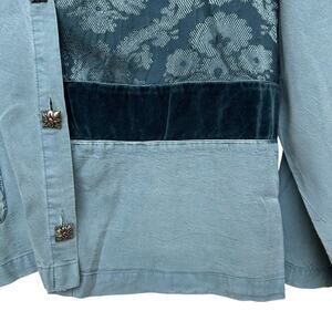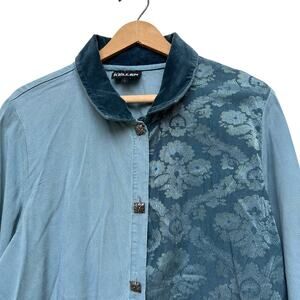 Embrace vintage charm with this stylish Nannette Keller shirt in size Large. Featuring a unique asymmetrical floral pattern, this piece combines textures with a mix of solid and floral jacquard sections, offering a sophisticated yet artistic look. Made in the USA, it is crafted from a blend of 50% Tencel, 30% Rayon, and 20% Cotton, giving it a soft feel and comfortable fit. Detailed with button closures and velvet accents, it’s perfect for layering over your favorite outfits or wearing alone. Excellent pre-owned condition.