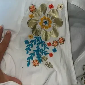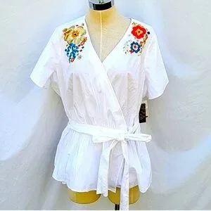 This elegant blouse features a wrap style with a tie front, short sleeves, and vibrant floral embroidery in orange and blue hues. The V-neckline and light fabric make it a perfect choice for a casual yet sophisticated look.