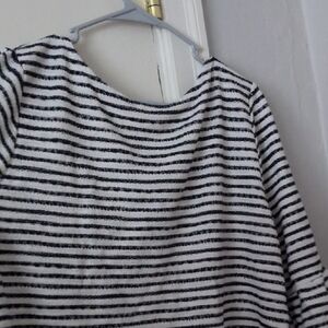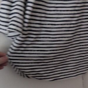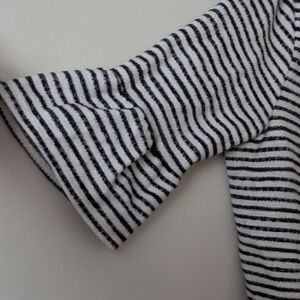Stylish blouse with black and white stripes. Features three-quarter sleeves and a comfortable fit. Perfect for casual outings.