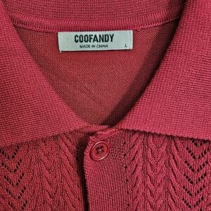 Like new Coofandy knit short-sleeved button-up polo style shirt gives a classic retro vibe. Handsome wine color (best shown in tag pictures). Size Large. Approx 23" pit to pit, 28.5" back of collar to bottom hem.
