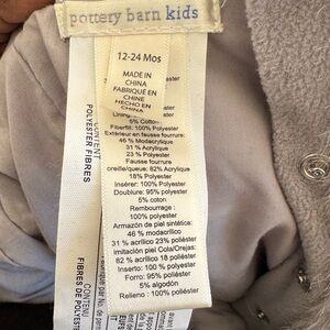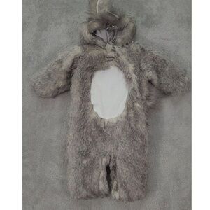 Adorable Pottery Barn Kids faux fur bunny pram suit in a soft gray tone. Designed to keep little ones warm and cozy during colder months. Features a plush faux fur exterior, attached hood with bunny ears, and snap-button leg openings for easy diaper changes. Fully lined for comfort with an ultra-soft feel—perfect for winter outings, photos, or special occasions