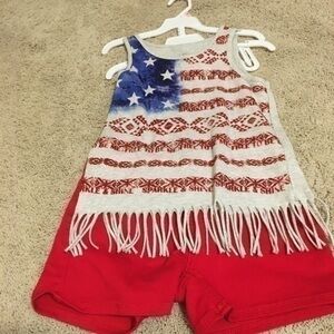Justice girls American outfit size 10 top / 12 shorts. Sparkly fringed patriotic tank top with amazing red shorts