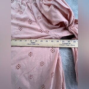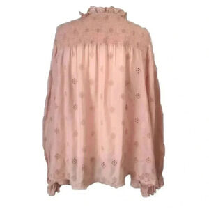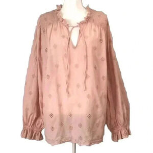 This Anthropologie blouse in the beautiful Pink Rose color is a must-have for any woman's wardrobe. Made from 100% cotton, it is lightweight, breathable, and perfect for all seasons. The relaxed fit and long sleeves make it comfortable and versatile, while the V-neckline adds a touch of elegance. The pullover closure and eyelet detailing add a unique touch to this classic blouse. Available in size 1X, it is perfect for plus-sized women. Whether you're dressing up or down, this blouse is sure to make a statement.