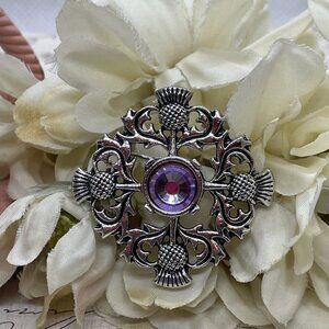 Adorn your outfit with a touch of classic elegance with our Thistle Pin, a versatile piece of jewelry that seamlessly blends with both casual and formal ensembles. The pin features a stunning purple rhinestone, set in a prong setting, which adds a regal hue to your attire. Its round shape and flower design, complemented by the shimmering silver plating, make it an ideal accessory for those who appreciate timeless style.