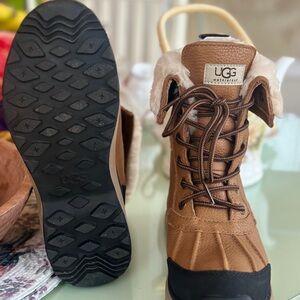 Stylish UGG winter boots. Tan leather with black accents. Warm and waterproof. Perfect for cold weather.
