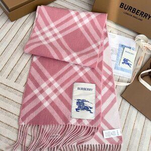 Elevate your style with this Burberry pink check cashmere scarf. Crafted from soft cashmere, it features the iconic check pattern in a lovely pink and white combo. The classic Burberry Equestrian Knight Design label adds a touch of luxury. Perfect for staying cozy while making a chic fashion statement. Comes with the original Burberry packaging. A timeless piece for any wardrobe!