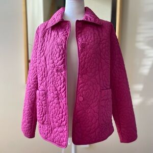 Cool days call for this chic puffer jacket. In a stunning raspberry magenta color with floral quilted rosette pattern. Features cozy patch pockets to keep your hands warm. A wintertime staple.