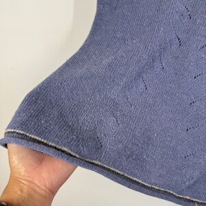 • Design details: Feminine V-neckline with subtle openwork knit pattern. Rolled edge hem and cuffs with contrast stitch trim.