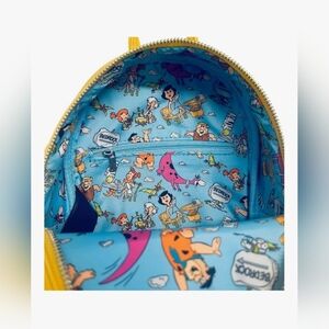 Yabba Dabba Doo! Take a page right out of history with the exclusive Loungefly take on the classic Flintstones cartoons! The front pocket depicts The Flintstones family having fun with the Rubble family - including Dino the Dinosaur! The iconic Flintstones house & neighborhood take up the background of the bag. Fred's catchphrase is in big bold letters for the enamel zipper charm, and the back of the bag has a print of all the characters waving and smiling from a circle.