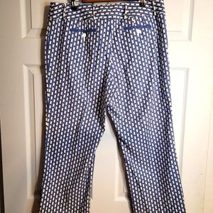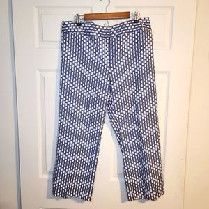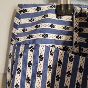 These are a pair of Anne Taylor blue and white floral strip pattern capri pants. See photos for details.