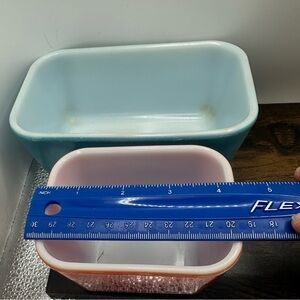 Product: These are vintage Pyrex refrigerator dishes, specifically the red 501-B and blue (or turquoise/teal) 502-B pieces, known as "fridgies".