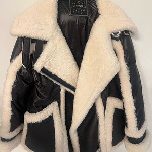 Stay warm and stylish with the shearling teddy jacket from Nicole Beneski/ PopSki London. Size medium. This chic black jacket with cream accents offers both comfort and elegance for any outing. Love this but I need a smaller size! Very good to like new condition. Brand tag is coming off slightly inside coat. Worn 1-2x but just too big for me sadly