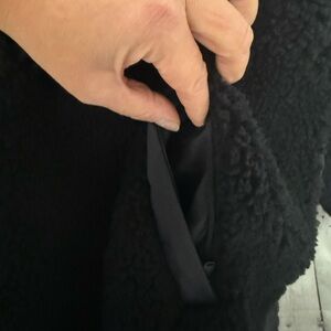 Cozy and chic black teddy jacket. Ideal for cold weather. Features a plush texture and stylish design. Zips down and snaps. Used but excellent condition. Super warm and stylish. Approximate measurements: Pit to pit: 27” Length: 39”