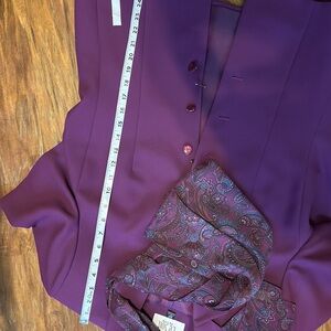 Stylish plum blazer with matching paisley scarf. Ideal for adding flair to any outfit.