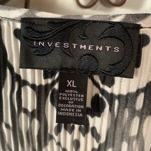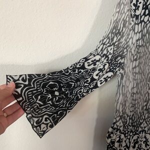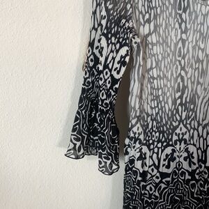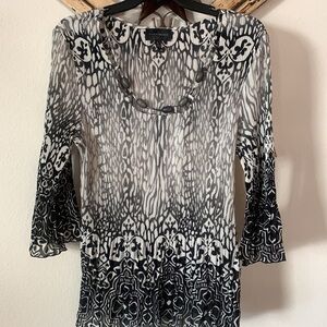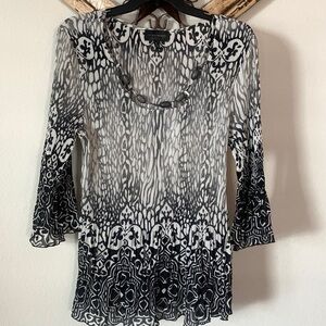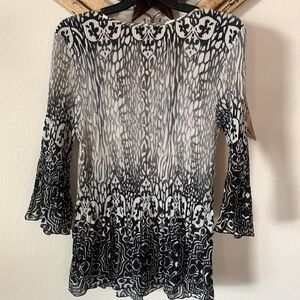 Super cute, ladies black, gray, and white top. Scoop neckline with cutouts “ looped” with gray wood beads. Fluttering 3/4” sleeves and hemline. Super comfortable stretchy polyester fabric. No stains or rips in fabric. Bundle to save!