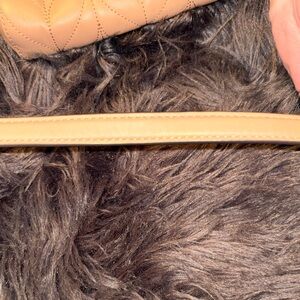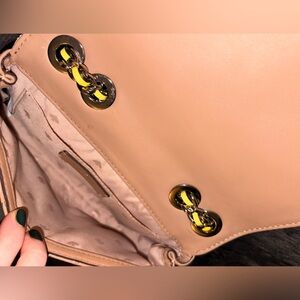 Stylish crossbody with quilted pattern, the color is hard to capture but more tan & white than pictures reflect. Features silver chain strap with neon yellow accents. Perfect for casual, everyday wear. Iconic logo with minimal wear from a smoke free home.
