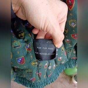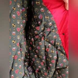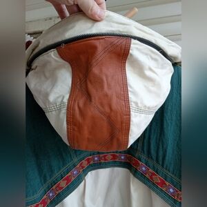 Stylish vintage jacket featuring a mix of green, cream, and red colors. Unique leather patches and accents add character.