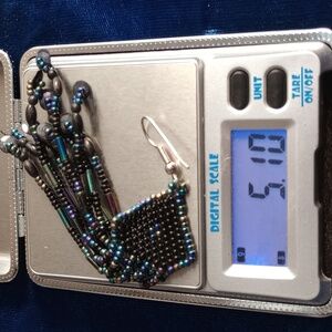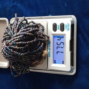 The beads display colors including black, blue, purple, bronze, and green depending on the lighting.