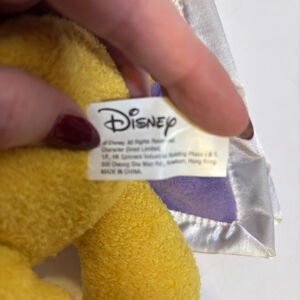 Adorable Disney Winnie the Pooh plush featuring a soft lovey blanket and built-in rattle. Pooh is wearing his classic red shirt with embroidered “Pooh” lettering. A sweet comfort toy for babies or a nostalgic Disney collectible.