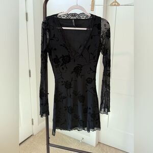 The Sriti dress features a mini length bodycon fit, plunge neckline and longline sleeves with lettuce hem. In a lined black rose flocked mesh, complete with lace detailing along the neckline.